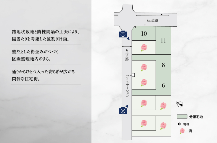 | 備考 | その他制限等/景観誘導区域、宅地造成及び特定盛土等規制法●6号地:土地面積162.72m2(路地状部分 約50.77m2含)/8号地:土地面積162.36m2(路地上部分 約50.78m2含)●水道分担金(110,000円・税込)および検査手数料(7,800円)が別途必要です。●私道負担/なし※ゴミステーション(3.46m2)は各購入者様にて1区画あたり1/11の持分を持っていただきます。●良好な住環境を保つために「まちなみガイドライン」がございます。※坪表示は1m2=0.3025坪で換算し、小数点第3位以下は切り捨てとしました。※徒歩分数は80m/1分で算出(1分未満は切り上げております)、自転車・車の所要時間は実走の場合です。※先着順販売の為、売約済みの場合がございます。予めご容赦ください。●宅建業法33条に規定する許可等の処分の番号/開発行為の検査済証:第完‐N2023137号(2024年7月23日付)●本分譲地の土地売買契約は、契約締結後3ヶ月以内に売主である積水ハウス株式会社との間で建築工事請負契約が成立することを条件として効力を生じます。期限までに、建築工事請負契約が成立しなかったときは、土地売買契約の無効が確定し、受領済の手付金等は、全額無利息にてすみやかに返還いたします。 | ||