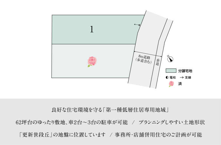 | 備考 | 景観誘導区域、宅地造成及び特定盛土等規制法●水道分担金・検査料/29,800円(13mmから20mmへ変更/税込)※坪表示は1m2=0.3025坪で換算し、小数点第3位以下は切り捨てとしました。※徒歩分数は80m/1分で算出(1分未満は切り上げております)、車の所要時間は実走の場合です。※確定測量の結果により土地面積が変更になる場合がございます。※先着順販売の為、売約済みの場合がございます。予めご容赦ください。●本分譲地の土地売買契約は、契約締結後3ヶ月以内に販売代理人である積水ハウス株式会社との間で建築工事請負契約が成立することを条件として効力を生じることとなります。期限までに建築工事請負契約が成立しなかったときは、土地売買契約の無効が確定し、受領済の手付金等は、全額無利息にてすみやかに返還いたします。 | ||