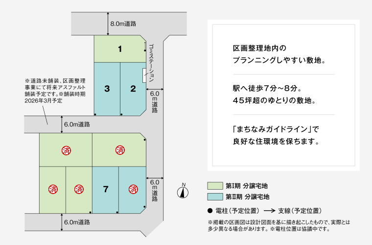 | 駐車場 | - | 道路の幅員 | 道路幅:6m~8m/道路幅の備考:東側道路6.0m、南側道路6.0m、北側道路6.0m・8.0m、未舗装(区画整理事業にて将来アスファルト舗装予定※舗装時期2026年3月予定) |