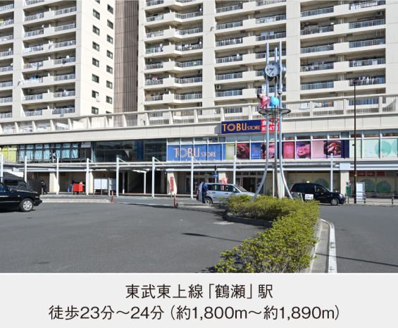 東武東上線「鶴瀬」駅 (現地から1800m~1890m。 徒歩23分~24分。)