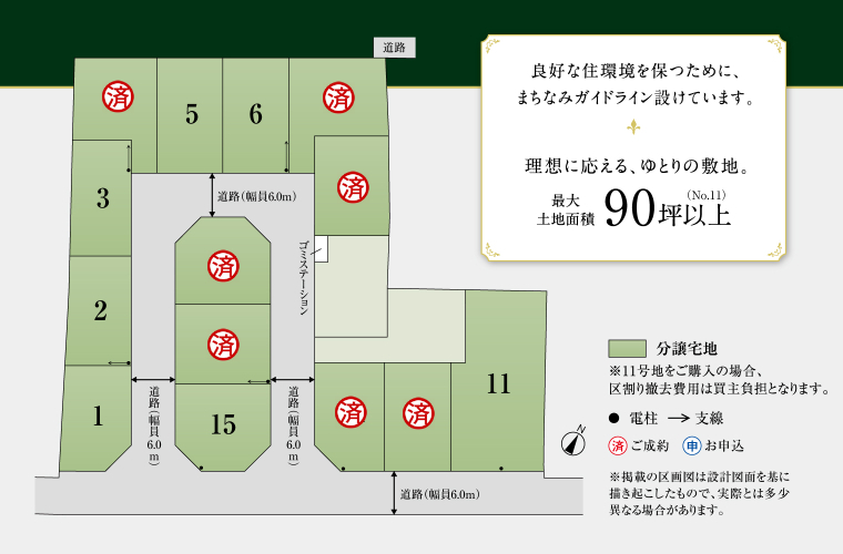 | 備考 | ●良好なまちなみの形成を図るため、「まちなみガイドライン」を作成しています。●11号地をご購入の場合、区割り撤去費用は買主負担となります。●ゴミステーション(6.5m2)共有持分あり(各戸1/17)※11号地をご購入の場合、共有持分は2/17となります。●水道分担金等:225,000円(20mm・税込)●道路の幅員及び舗装:6.0m(アスファルト舗装)※坪表示は1m2=0.3025坪で換算し、小数点以下第3位以下は切り捨てとしました。※徒歩分数表示は1分あたり80mで計算しています。(1分未満は切り上げています。)車による所要時間は、道路交通状況により異なります。●景観法あり●先着順受付中●本分譲地の土地売買契約は、契約締結後3ヶ月以内に売主である積水ハウス株式会社との間で建築工事請負契約が成立することを条件として効力を生じます。期限までに、建築工事請負契約が成立しなかったときは、土地売買契約の無効が確定し、受領済の手付金等は、全額無利息にてすみやかに返還いたします。 | ||