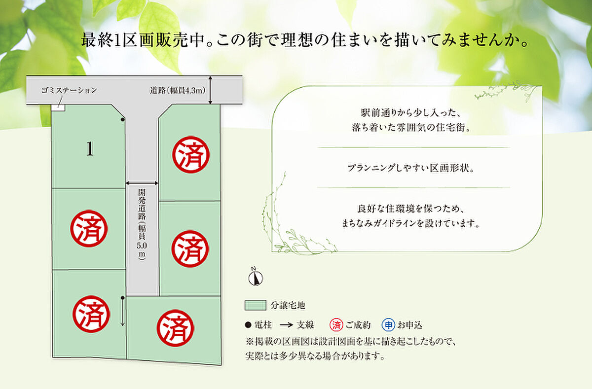 | 備考 | ●良好なまちなみの形成を図るため、「まちなみガイドライン」を作成しています。●ゴミステーション(2.00m2)共有持分あり(各戸1/6)●水道分担金等/228,000円(20mm・税込)●道路の幅員及び舗装:4.3m、5.0m(アスファルト舗装)※坪表示は1m2=0.3025坪で換算し、小数点以下第3位以下は切り捨てとしました。※徒歩分数表示は1分あたり80mで計算しています。(1分未満は切り上げています。)車による所要時間は、道路交通状況により異なります。●航空法あり●自然公園法あり●景観法あり●先着順受付中●本分譲地の土地売買契約は、契約締結後3ヶ月以内に売主である積水ハウス株式会社との間で建築工事請負契約が成立することを条件として効力を生じます。期限までに、建築工事請負契約が成立しなかったときは、土地売買契約の無効が確定し、受領済の手付金等は、全額無利息にてすみやかに返還いたします。 | ||