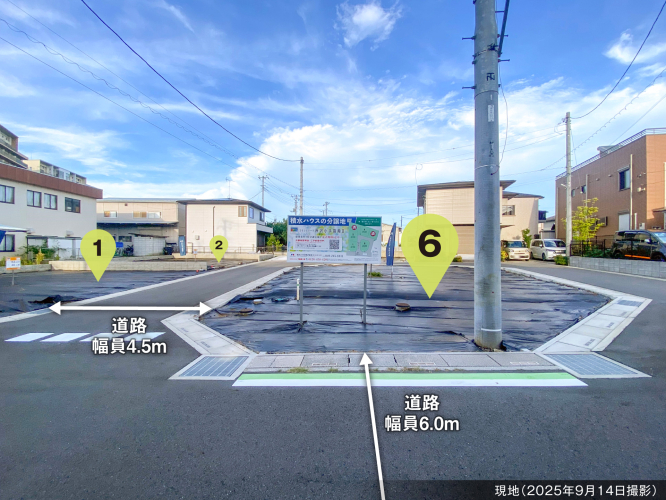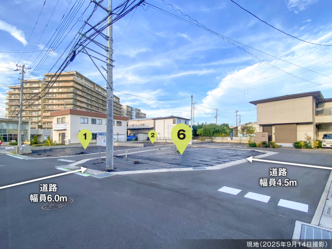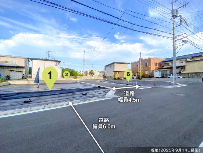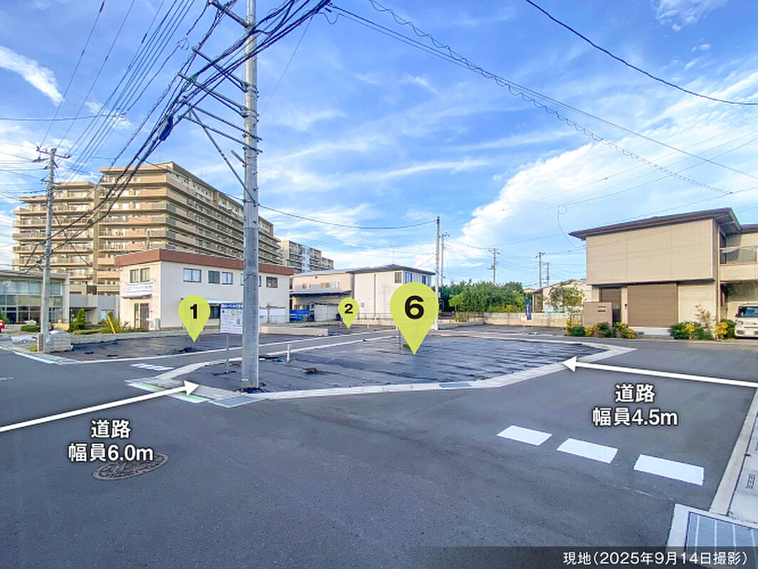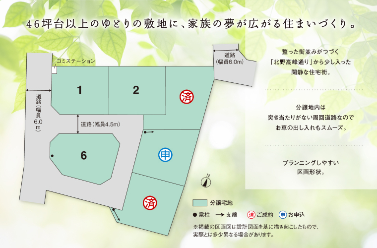 ■4.5mの回遊道路新設の総6区画の分譲地■46坪以上の敷地・プランニングしやすい敷地形状■統一感のある美しい街づくり・外構計画を「まちなみガイドライン」に沿ってご提案致します。