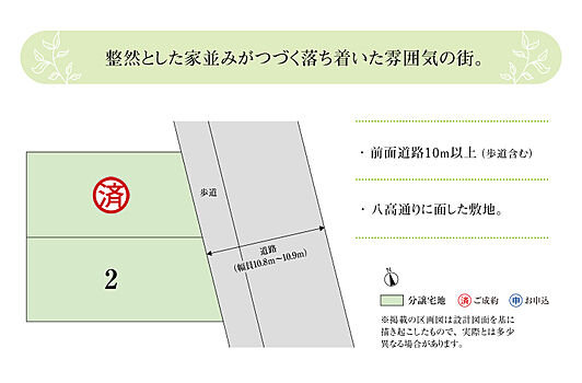 | 備考 | ●良好なまちなみの形成を図るため、「まちなみガイドライン」を作成しています。●水道分担金等/228,000円(20mm・税込)●道路の幅員及び舗装:10.8m~10.9m(アスファルト舗装)※坪表示は1m2=0.3025坪で換算し、小数点以下第3位以下は切り捨てとしました。※徒歩分数表示は1分あたり80mで計算しています。(1分未満は切り上げています。)車による所要時間は、道路交通状況により異なります。●航空法あり●景観法あり●自然公園法あり●先着順受付中●本分譲地の土地売買契約は、契約締結後3ヶ月以内に売主である積水ハウス株式会社との間で建築工事請負契約が成立することを条件として効力を生じます。期限までに、建築工事請負契約が成立しなかったときは、土地売買契約の無効が確定し、受領済の手付金等は、全額無利息にてすみやかに返還いたします。 | ||
