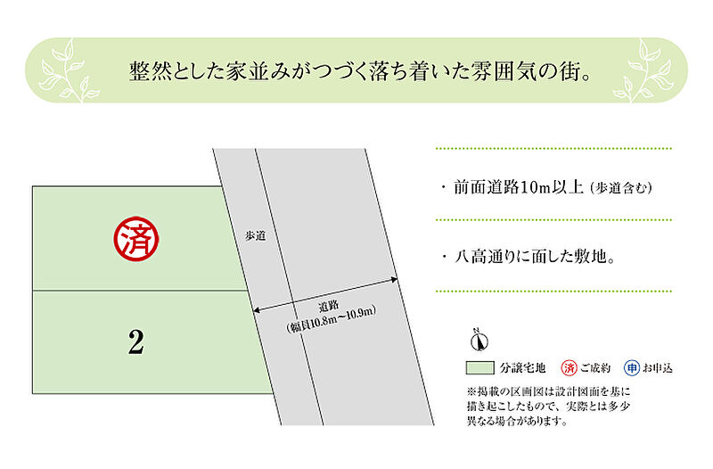 | 建築条件 | 建築条件付 建築条件付き土地とは一定期間内に、その土地に建築する建物の請負契約が締結されることを条件に販売される土地のことです。 土地売買契約締結後、建築請負会社と購入した土地に建築する建物について協議することになります。広告に参考プランが掲載されている場合でも、プランは一例であり、実際の建築プランは建築請負会社と土地購入者で協議・検討することが可能です。 期間内に建築プランが決まらず建築請負契約が成立しなければ土地売買契約は白紙となり、支払済みの金銭はすべて返還されます。 建築請負会社が指定されている場合と指定されていない場合があります。 また、建築条件付き土地の価格には、建物価格は含まれません。 |
