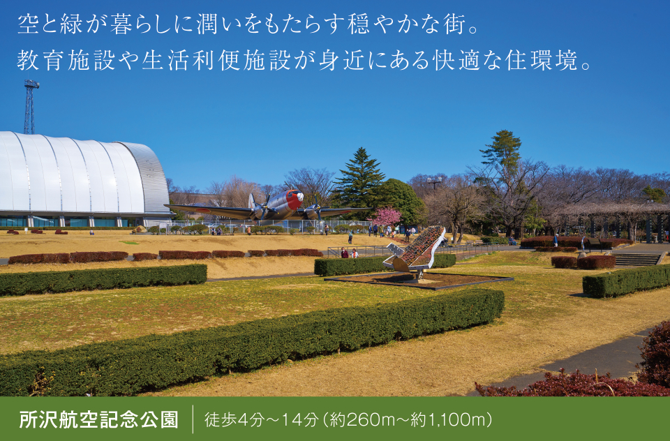 所沢市内に位置する日本の航空発祥の地、航空公園。“空”にゆかりのある“所沢”のこの街に積水ハウスは「ソラトコ」という愛称を名づけ、分譲宅地を販売中!