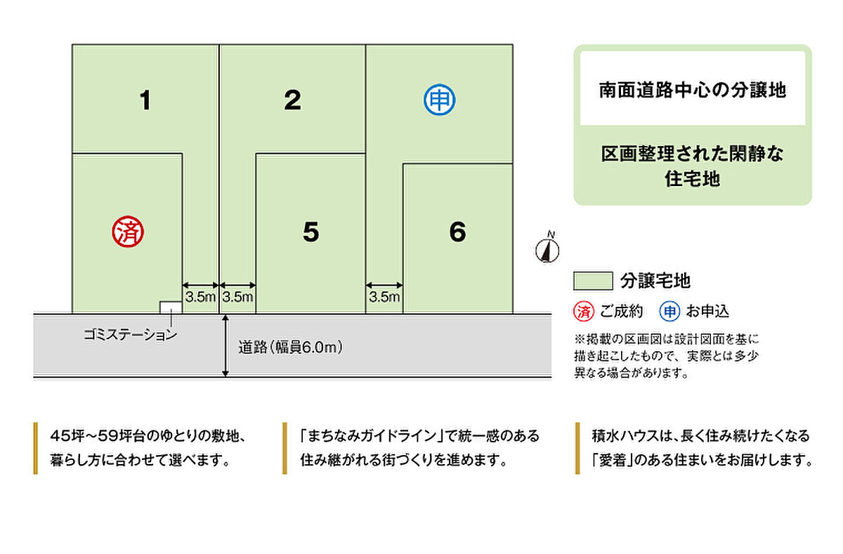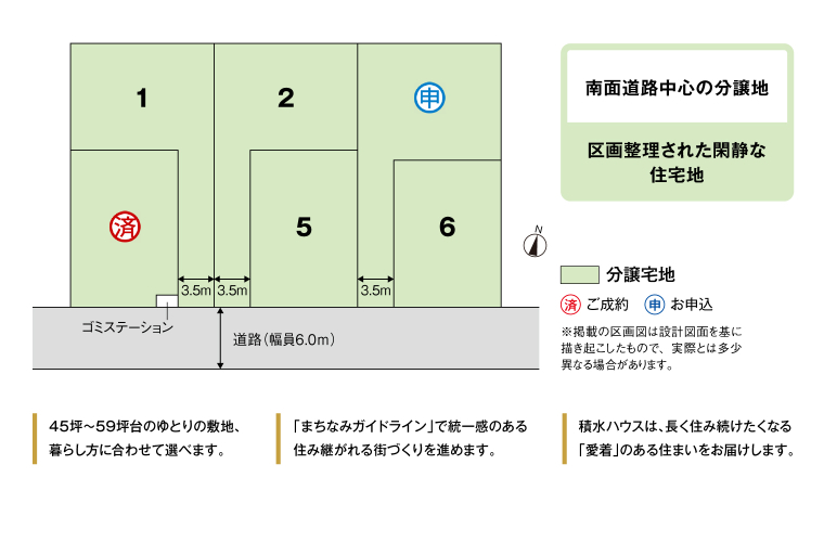 | 備考 | 景観法あり、都市再生特別措置法あり、農地法あり●農地転用受理通知番号:川農委5B第92号(令和7年12月12日付)●良好なまちなみの形成を図るため、「まちなみガイドライン」を作成しています。●水道分担金等:257,400円(税込、Φ20mm)※確定測量後、土地面積が変更になる場合がございます。※坪表示は1m2=0.3025坪で換算し、小数点以下第3位以下は切り捨てとしました。※徒歩分数は80m/1分で算出しております。(1分未満は切り上げています。)※掲載の車による所要時間は実走のもので、道路交通状況により異なります。●先着順受付中●本分譲地の土地売買契約は、契約締結後3ヶ月以内に売主である積水ハウス株式会社との間で建築工事請負契約が成立することを条件として効力を生じます。期限までに、建築工事請負契約が成立しなかったときは、土地売買契約の無効が確定し、受領済の手付金等は、全額無利息にてすみやかに返還いたします。 | ||