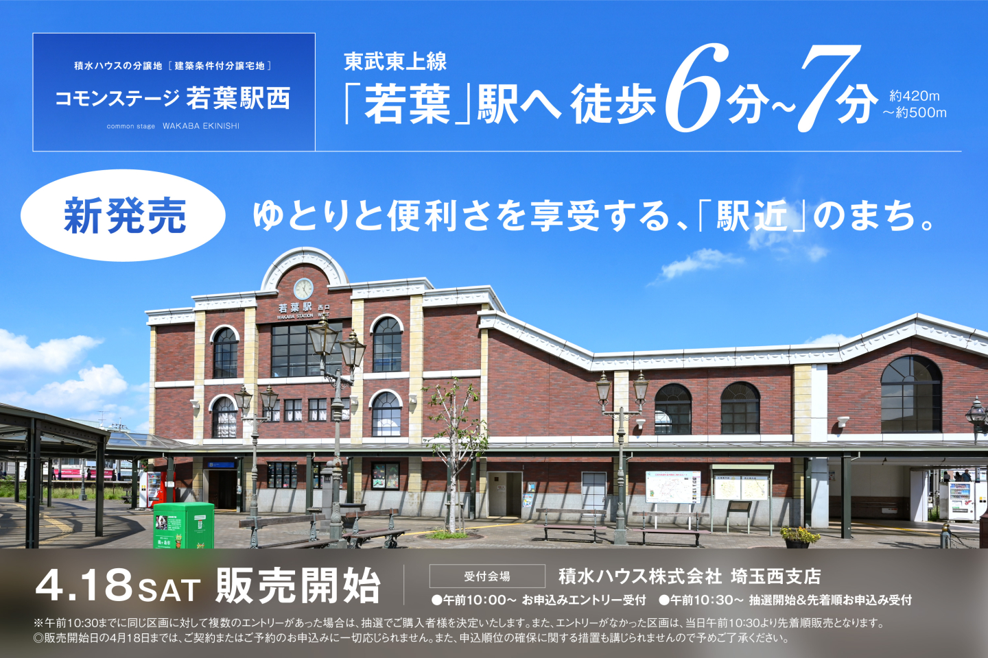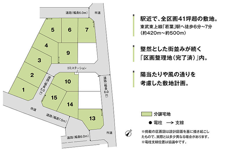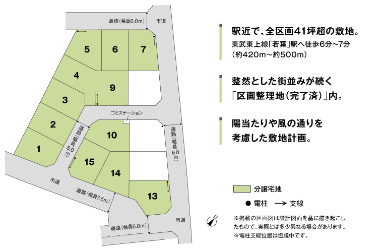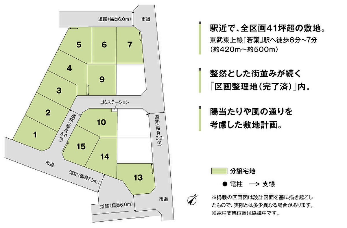 | 備考 | 地区計画あり(若葉駅西口地区計画C地区)、景観法あり、国土法あり、農地法あり、文化財保護法あり(埋蔵文化財包蔵地:北権現遺跡)●良好なまちなみの形成を図るため、「まちなみガイドライン」を作成しています。●ゴミステーション(2.86m2)共有持分あり(各戸1/15)●水道分担金等:240,000円(税込、Φ20mm)●道路の幅員及び舗装:5.0m、6.0m、7.5m(アスファルト舗装)●農地転用受理通知番号:鶴農5第1号、鶴農5第2号(令和8年1月22日付)●地区計画あり(若葉駅西口地区計画C地区)●景観法あり●国土法あり●農地法あり●文化財保護法あり(埋蔵文化財包蔵地:北権現遺跡)※坪表示は1m2=0.3025坪で換算し、小数点以下第3位以下は切り捨てとしました。 ※徒歩分数は80m/1分で算出しております。(1分未満は切り上げています。) ※掲載の車による所要時間は実走のもので、道路交通状況により異なります。●2026年4月18日(土)販売開始 ●受付会場/積水ハウス株式会社 埼玉西支店 ・午前10:00~ お申込みエントリー受付 ・午前10:30~ 抽選開始&先着順お申込み受付 ※午前10:30までに同じ区画に対して複数のエントリーがあった場合は、抽選でご購入者様を決定いたします。また、エントリーがなかった区画は、当日午前10:30より先着順販売となります。 ◎販売開始日の2026年4月18日までは、ご契約またはご予約のお申込みに一切応じられません。また、申込順位の確保に関する措置も講じられませんので予めご了承ください。●本分譲地の土地売買契約は、契約締結後3ヶ月以内に売主である積水ハウス株式会社との間で建築工事請負契約が成立することを条件として効力を生じます。期限までに、建築工事請負契約が成立しなかったときは、土地売買契約の無効が確定し、受領済の手付金等は、全額無利息にてすみやかに返還いたします。 | ||