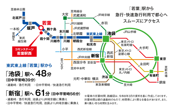 ■東武東上線「若葉」駅まで徒歩6分~7分(約420m~約500m)■東武東上線は直通運行している東京メトロ副都心線・有楽町線もあり、都内へアクセスしやすく通勤通学に便利です。