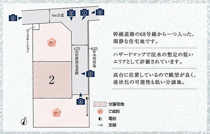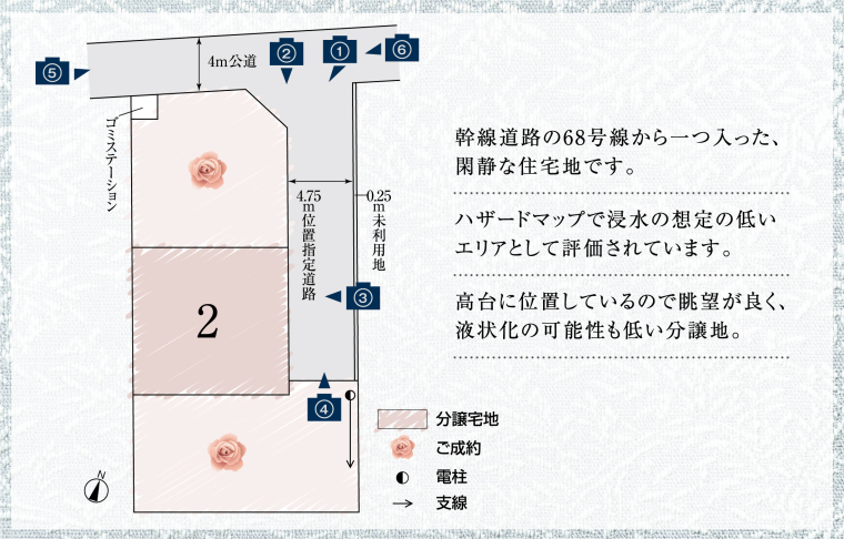 大きな通りから1本入ったところにある、緑豊かで閑静な住宅地。洪水ハザードマップにかからず、液状化の可能性の低い高台に位置しています。