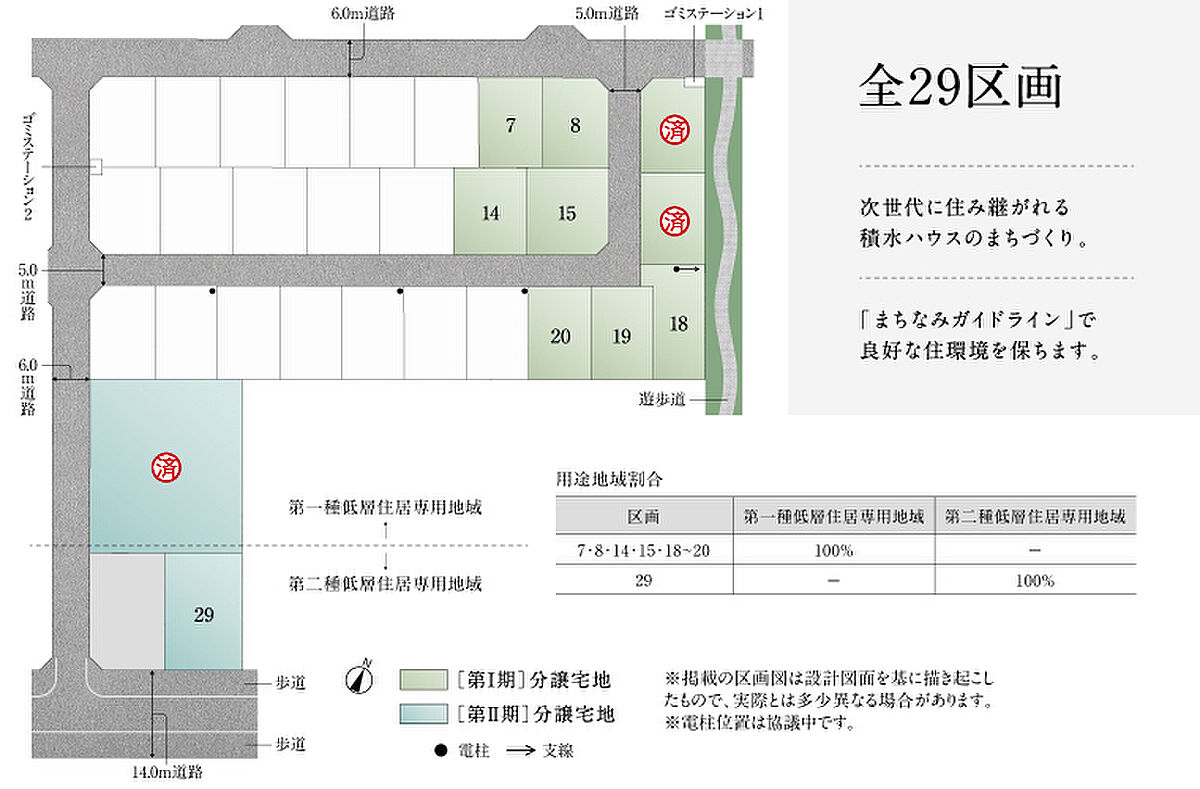 | 備考 | 吉川中央地区地区計画B地区(本物件南側道路(第2-310号線 吉川市道)端より北側20m迄)、その他はA地区●水道分担金(20mm)/330,000円(税込)●手付金等の保全機関/西日本住宅産業信用保証株式会社●良好なまちなみの形成を図るため、「まちなみガイドライン」を作成しています。※土地有効面積とは別に、ゴミ集積場1(5.17m2)は1/18ずつ、ゴミ集積場2(5.00m2)は1/15ずつ、共有持分としてご所有いただきます。※確定測量の結果により土地面積が変更になる場合がございます。※坪表示は1m2=0.3025坪で換算し、小数点第3位以下は切り捨てとしました。※徒歩分数は1分あたり80mで計算しています。(1分未満は切り上げています。) ※先着順販売中のため、売約済みの場合がございます。予めご了承ください。●本分譲地の土地売買契約は、契約締結後3ヶ月以内に売主である積水ハウス株式会社との間で建築工事請負契約が成立することを条件として効力を生じます。期限までに、建築工事請負契約が成立しなかったときは、土地売買契約の無効が確定し、受領済の手付金等は、全額無利息にてすみやかに返還いたします。 | ||