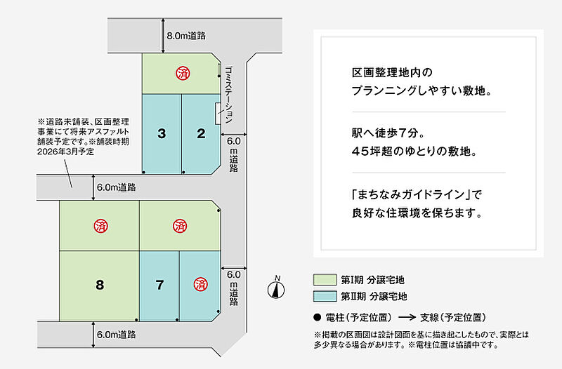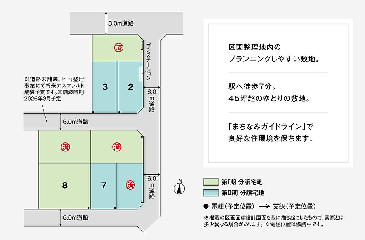 積水ハウスの分譲宅地「コモンステージ吉川美南II」■全8区画■JR武蔵野線「吉川美南」駅へ徒歩7分(約510m~約550m)■平坦地・整形地・角地区画あり■前面道路6m