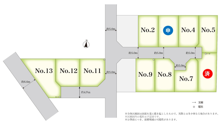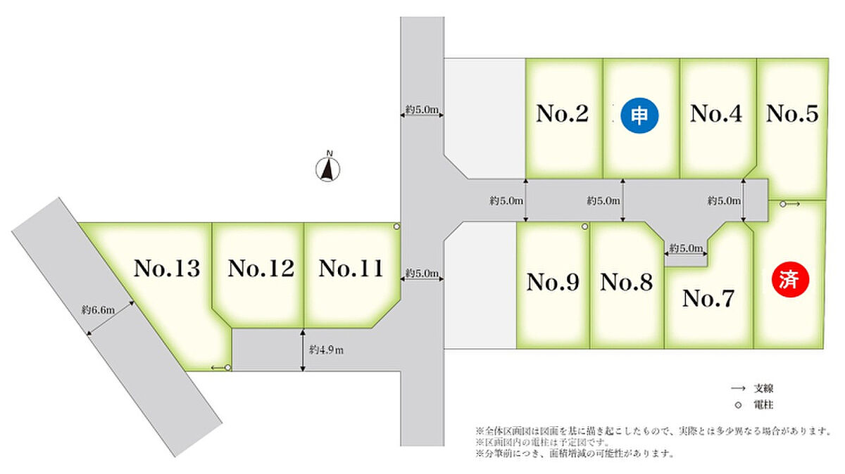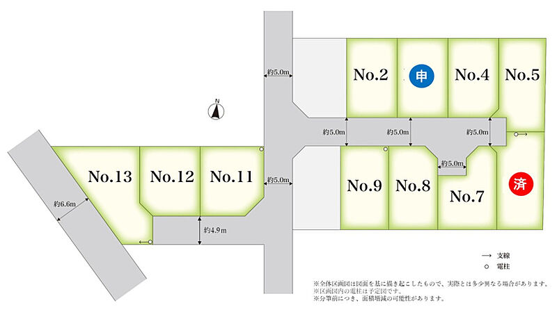 | 開発面積 | 1962.69m2 | 建ぺい率・容積率 | 建ぺい率:60%(No,11は角地緩和適用にて70%、No,13は二方向道路による緩和適用にて70%)/容積率:200% |