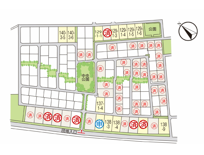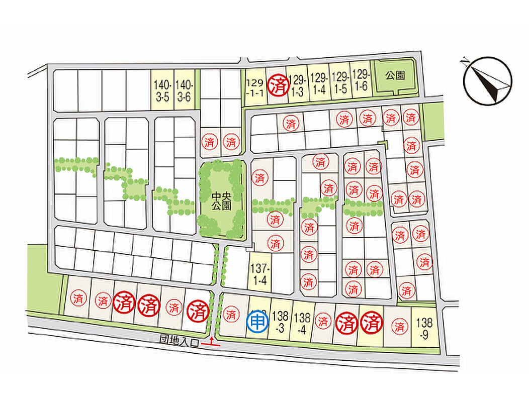 | 主たる設備の概要 | 電気(九州電力)ガス(都市ガス・筑紫ガス)水道:公営水道、雑排水・汚水:公共下水道、雨水:U字側溝、街路灯(設置済)※水道加入負担金有り(20mm/210,000円税込) | 開発許可番号 | 完成済(129-1-1、129-1-3、129-1-4、129-1-5、129-1-6、137-1-4、138-3、138-4、138-9、140-3-5、140-3-6) |