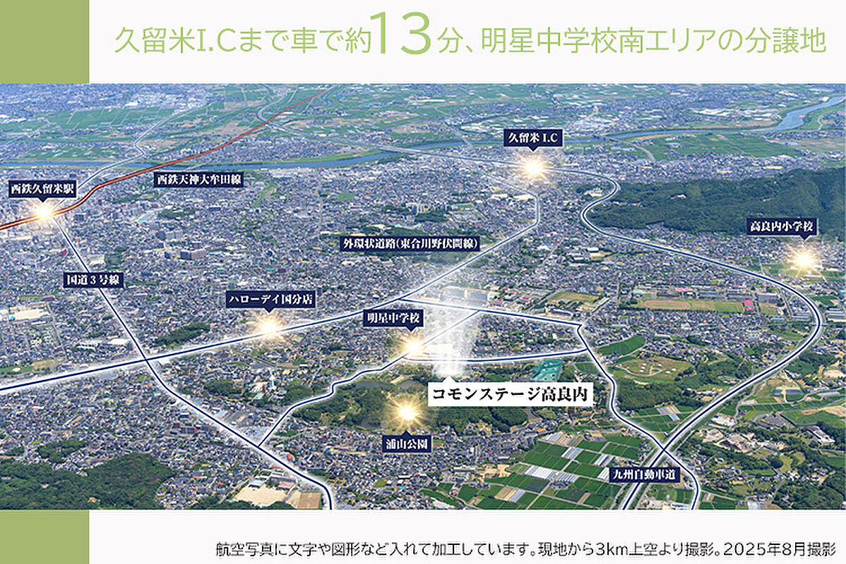 コモンステージ高良内は、久留米中心地から約5キロ圏内と久留米市街地にも出やすく、徒歩10分圏内に浦山公園や明星中学校があり、子育て世代に魅力あふれる生活環境です。