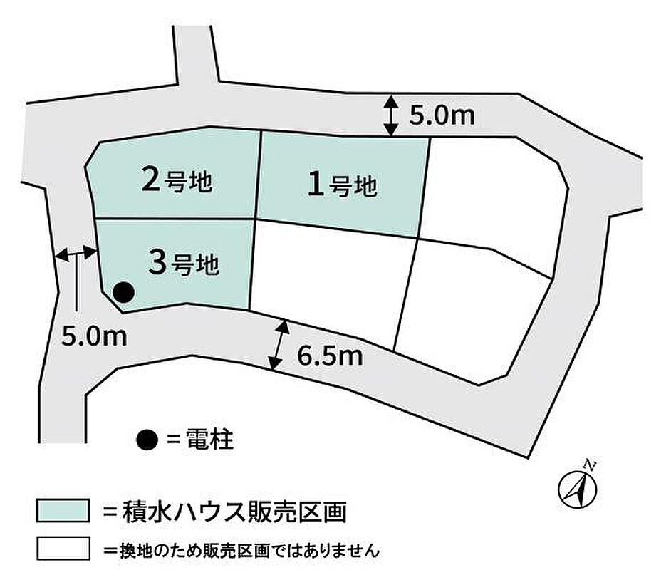 | 駐車場 | - | 道路の幅員 | 道路幅:5m~6.5m/道路幅の備考:1・2号地は5mに接する、3号地は5m・6.5mに接する |