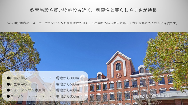 山里小学校まで徒歩4分、中学校までは徒歩7分。徒歩10分圏内に通勤通学、買い物に利用できるスーパー、コンビニもあり便利です。