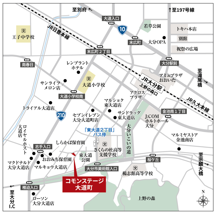 JR日豊本線「大分」駅 徒歩13分 「」駅 バス 大分バス 東大道2丁目 徒歩4分 |