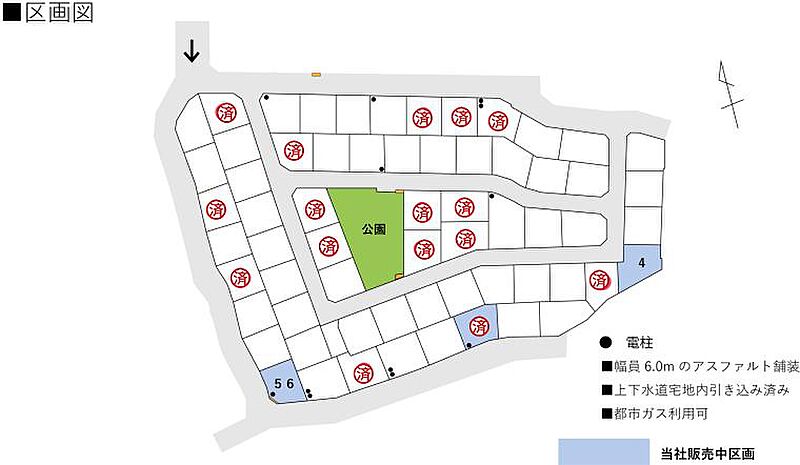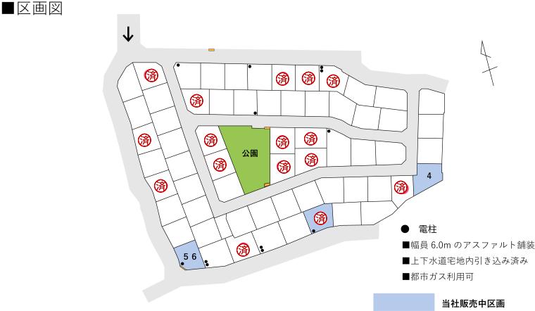 | 主たる設備の概要 | 電気(九州電力)、都市ガス(日本ガス)、上水道(公営水道)、下水道・雑排水(公共下水)、雨水(U字溝) | 開発許可番号 | 完成済(4、56) |