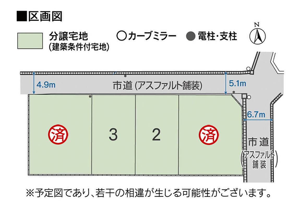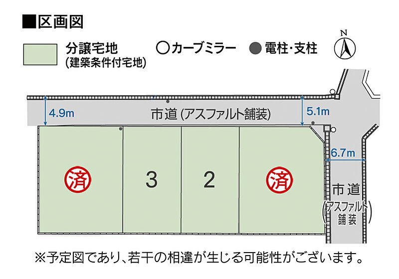 | 駐車場 | - | 道路の幅員 | 道路幅:4.9m~6.7m/道路幅の備考:北側道路:4.9m・5.1m、東側道路:6.7m(アスファルト舗装) |