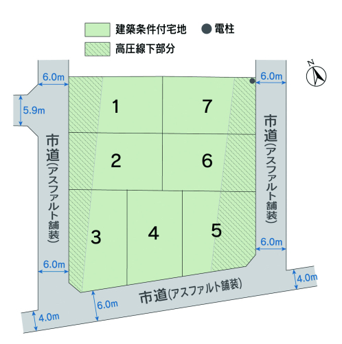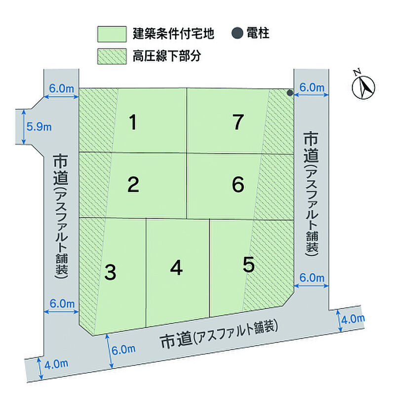 | 備考 | 景観法、水防法※高圧線下面積(1号地:約71m2、2号地:約60m2、3号地:約74m2、4号地:なし、5号地:約119m2、6号地:約72m2、7号地:約58m2)※各号地に九州電力による地役権を設定します。※高圧線の最下垂時から3.6mの範囲内には建築できません。●下水道受益者負担金/1m2あたり250円●土地面積は、境界画定測量において増減が生じる場合があります。●その他の制限/景観法、水防法●良好なまちなみの形成を図るため、「まちなみガイドライン」を作成しています。●徒歩分数は80m=1分で算出しています。●車での所要時間は天候や時間帯など道路状況の変化によって異なる場合がございます。●距離・時間の起点は各施設までの距離が最短と最長の区画としており、ルートなどによって異なります。●本分譲地の土地売買契約は、契約締結後3ヶ月以内に売主である積水ハウス株式会社との間で建築工事請負契約が成立することを条件として効力を生じます。期限までに、建築工事請負契約が成立しなかったときは、土地売買契約の無効が確定し、受領済の手付金等は、全額無利息にてすみやかに返還いたします。 | ||