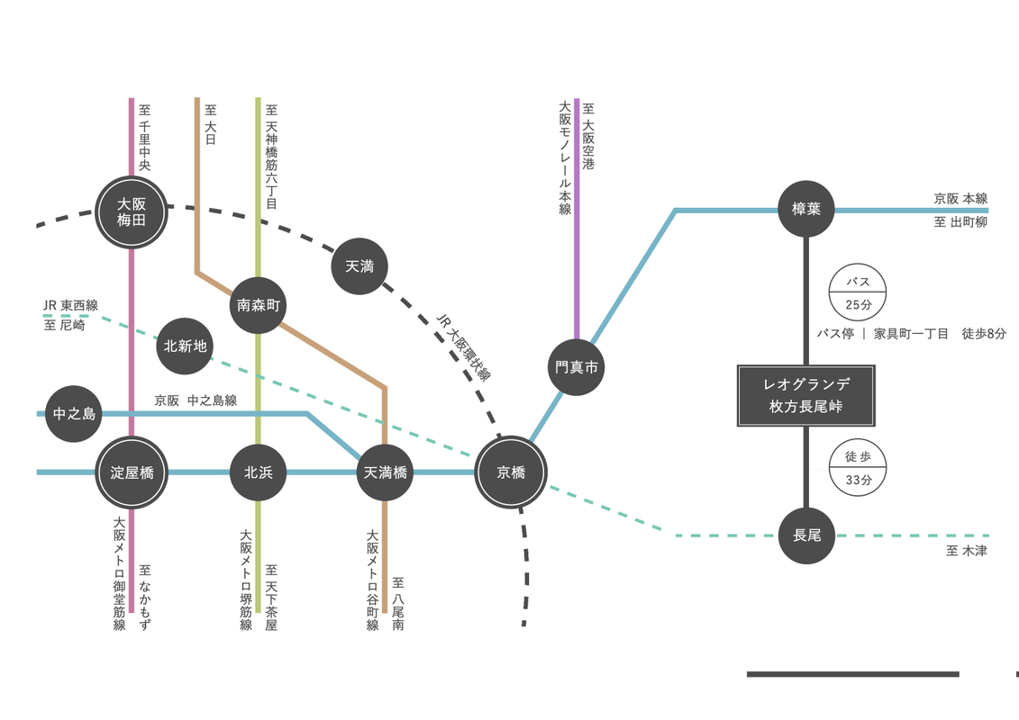 京阪本線「樟葉」駅 バス25分「家具町一丁目」バス停 徒歩8分 JR片町線(学研都市線)「長尾」駅 徒歩33分 |