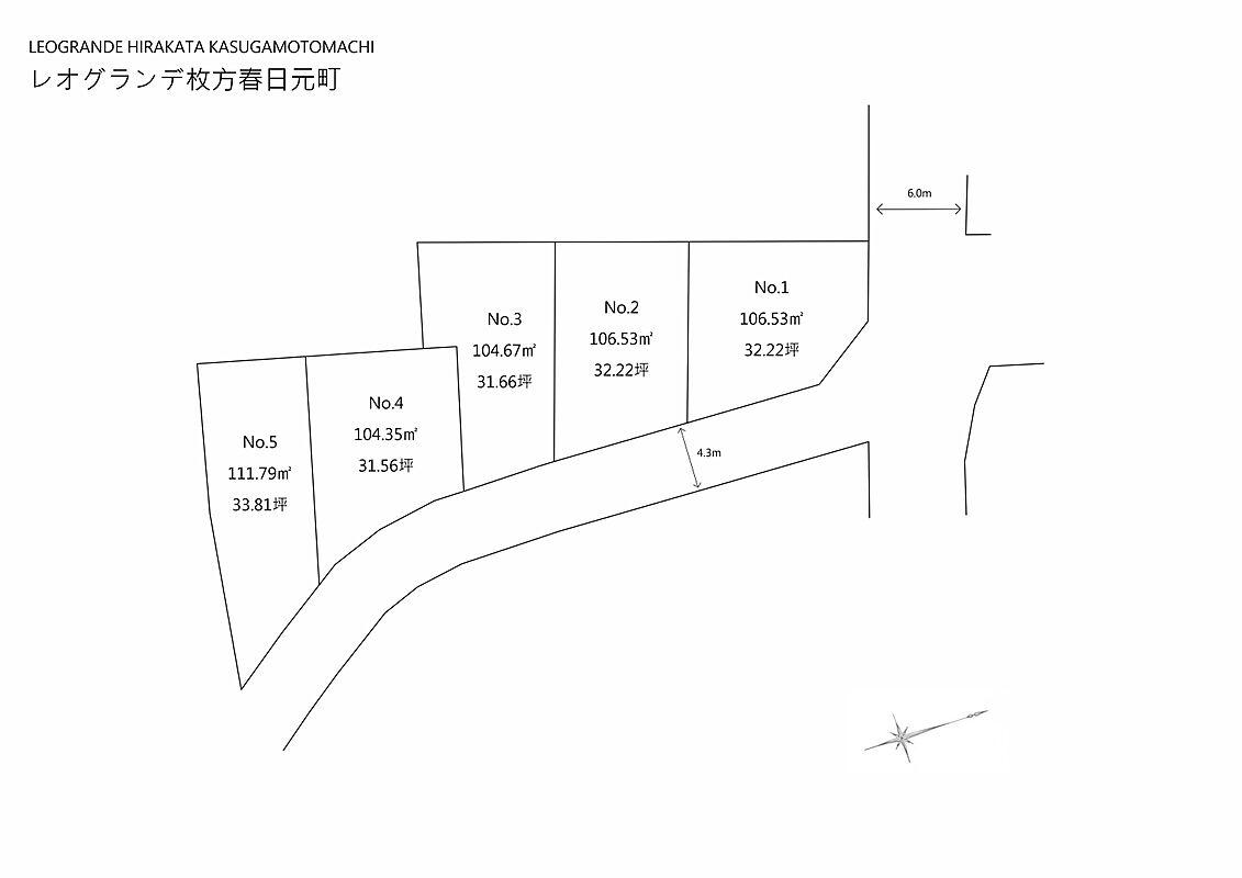 枚方市春日元町に全5区画の分譲地。JR学研都市線「津田」駅まで徒歩13分、敷地面積104.35m2~111.78m2のゆとりある区画で、自由設計に対応しています。