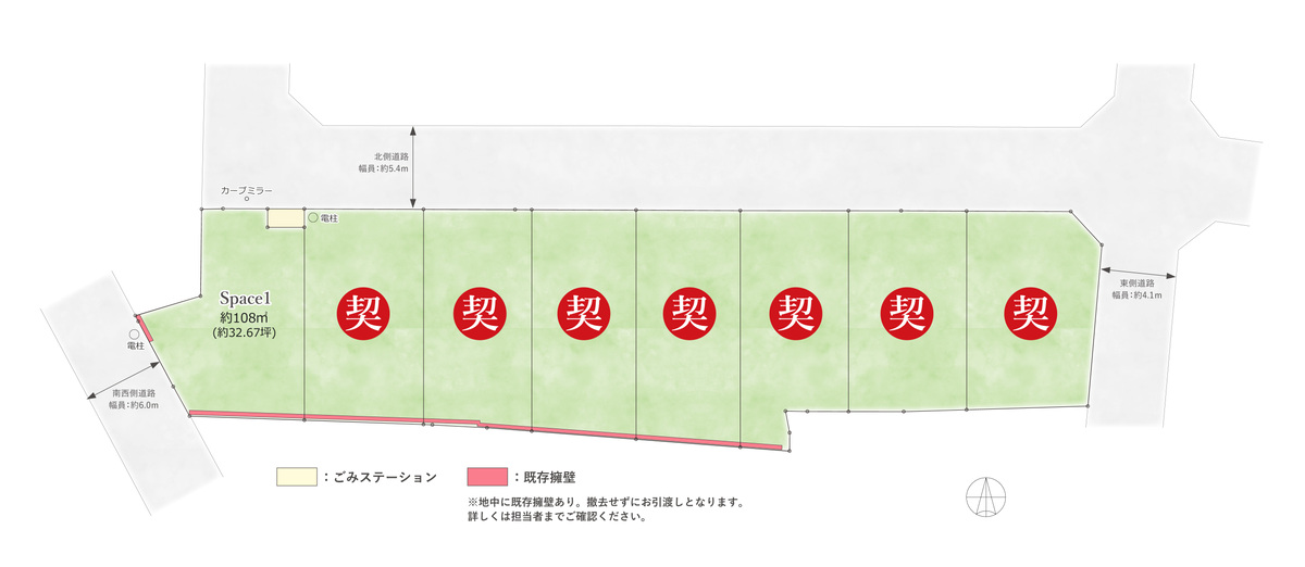 ●全8区画の大きな分譲地!最終1区画となりました。土地面積は約108m2で前面道路の南西側の幅員は約6.0mございます。