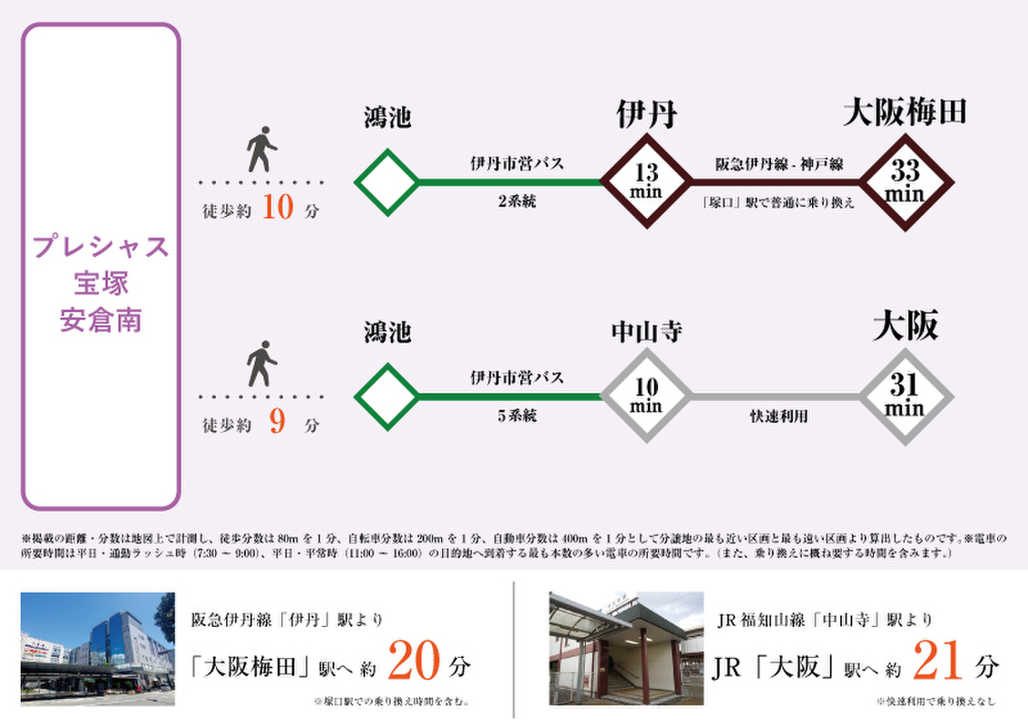 JR福知山線「中山寺」駅 バス乗車約10分「鴻池」バス停 徒歩10分 阪急伊丹線「伊丹」駅 バス乗車約15分「鴻池」バス停 徒歩9分 阪急宝塚本線「宝塚」駅 バス乗車約15分「宝塚安倉団地」バス停 徒歩6分 |