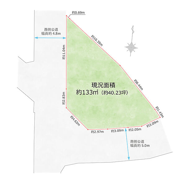 ●土地面積は約133m2(約40.23坪)以上の南西角地。前面道路の幅員も約4.8m~約5.0mとなっております。周辺は昔ながらの趣ある木造の住宅や新しい邸宅が混じる住宅街です。