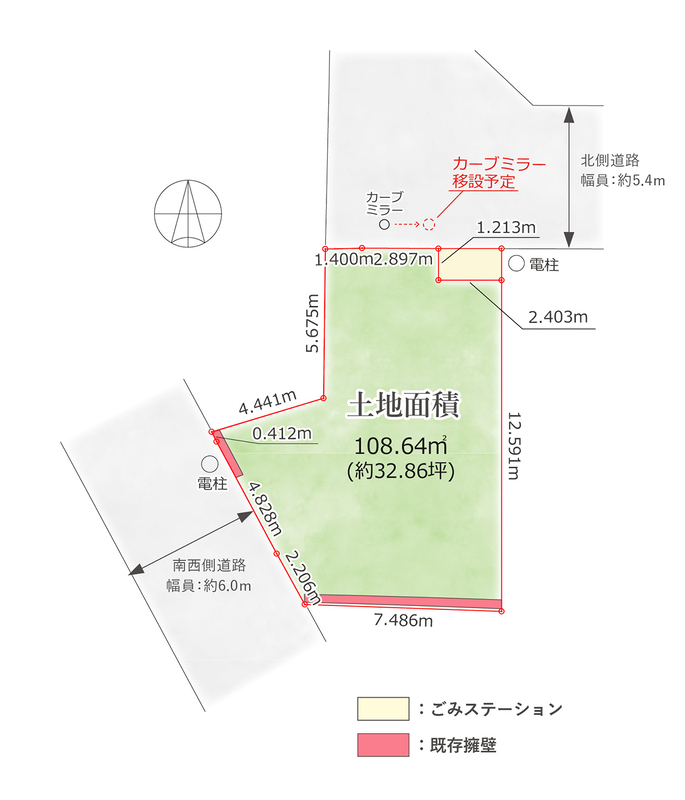 ●限定1区画の大きな分譲地!土地面積は108.64m2で、前面道路は南西側幅員約6.0mと北側幅員約5.4mございます。