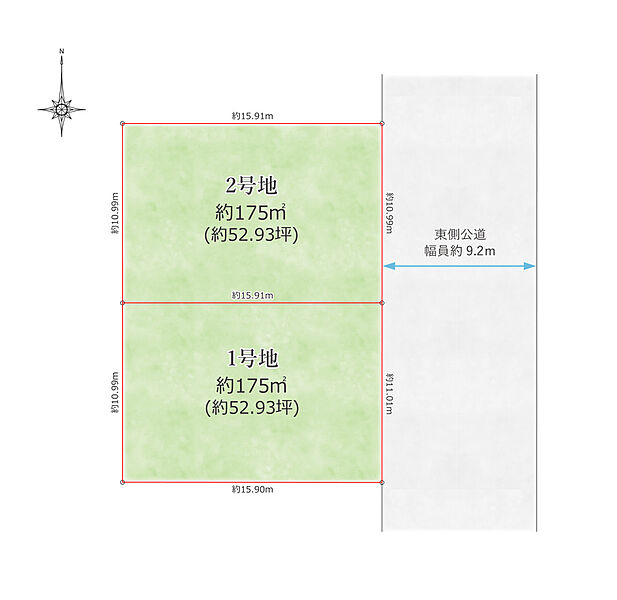 ●「あかしあ台5丁目」土地面積 約175m2(約52.93坪)全2区画。神戸電鉄公園都市線「南ウッディタウン」駅まで徒歩約8分の立地。前面道路は東側公道:幅員約9.2mございます。