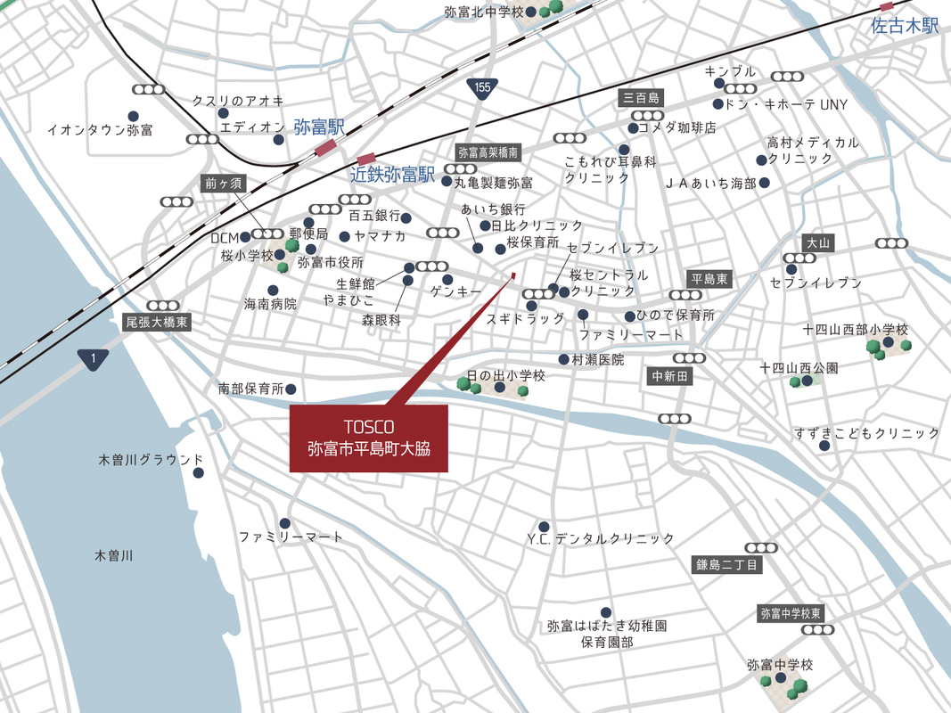 近鉄名古屋線「近鉄弥富」駅 徒歩11分 JR関西本線「弥富」駅 徒歩14分 名鉄尾西線「弥富」駅 徒歩14分 |