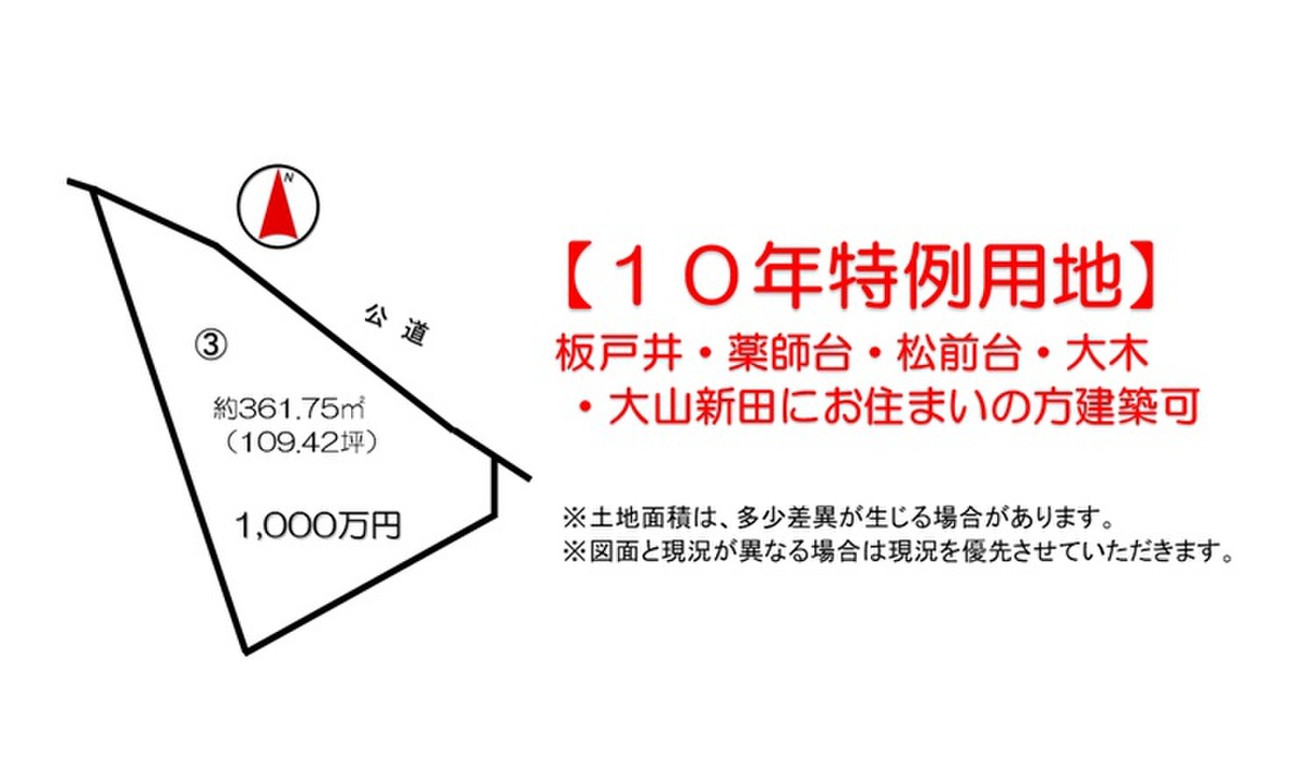 | 建築条件 | 建築条件付 建築条件付き土地とは一定期間内に、その土地に建築する建物の請負契約が締結されることを条件に販売される土地のことです。 土地売買契約締結後、建築請負会社と購入した土地に建築する建物について協議することになります。広告に参考プランが掲載されている場合でも、プランは一例であり、実際の建築プランは建築請負会社と土地購入者で協議・検討することが可能です。 期間内に建築プランが決まらず建築請負契約が成立しなければ土地売買契約は白紙となり、支払済みの金銭はすべて返還されます。 建築請負会社が指定されている場合と指定されていない場合があります。 また、建築条件付き土地の価格には、建物価格は含まれません。 |