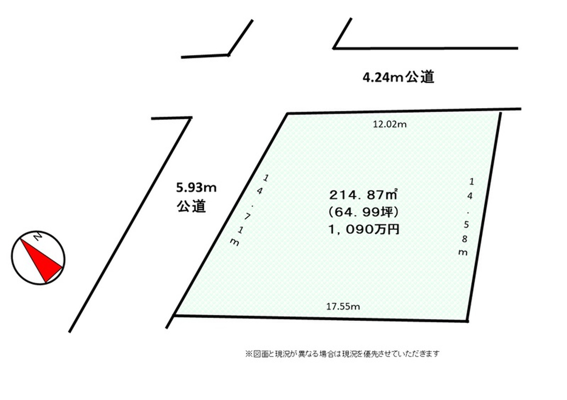 | 駐車場 | 2台 | 道路の幅員 | 北西5.93m公道、北東4.24m公道 |