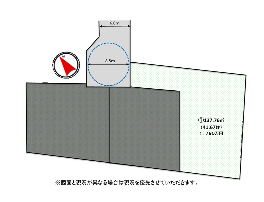 | 建築条件 | 建築条件付 建築条件付き土地とは一定期間内に、その土地に建築する建物の請負契約が締結されることを条件に販売される土地のことです。 土地売買契約締結後、建築請負会社と購入した土地に建築する建物について協議することになります。広告に参考プランが掲載されている場合でも、プランは一例であり、実際の建築プランは建築請負会社と土地購入者で協議・検討することが可能です。 期間内に建築プランが決まらず建築請負契約が成立しなければ土地売買契約は白紙となり、支払済みの金銭はすべて返還されます。 建築請負会社が指定されている場合と指定されていない場合があります。 また、建築条件付き土地の価格には、建物価格は含まれません。 |