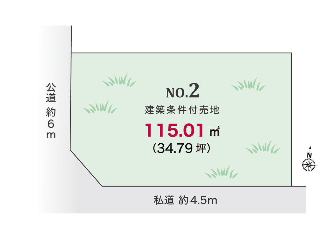 | 建築条件 | 建築条件付 建築条件付き土地とは一定期間内に、その土地に建築する建物の請負契約が締結されることを条件に販売される土地のことです。 土地売買契約締結後、建築請負会社と購入した土地に建築する建物について協議することになります。広告に参考プランが掲載されている場合でも、プランは一例であり、実際の建築プランは建築請負会社と土地購入者で協議・検討することが可能です。 期間内に建築プランが決まらず建築請負契約が成立しなければ土地売買契約は白紙となり、支払済みの金銭はすべて返還されます。 建築請負会社が指定されている場合と指定されていない場合があります。 また、建築条件付き土地の価格には、建物価格は含まれません。 |