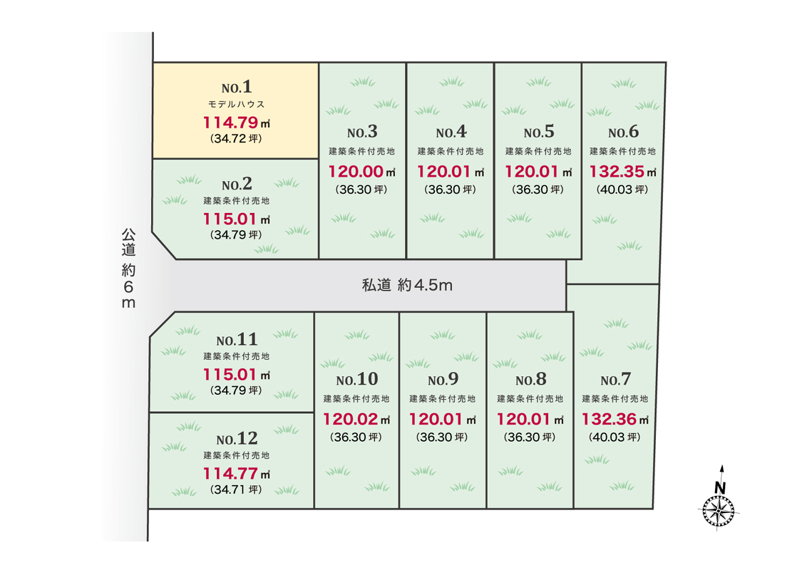 | 建物面積 | - | 土地面積 | 114.77m2(12区画)~132.36m2(7区画) |
