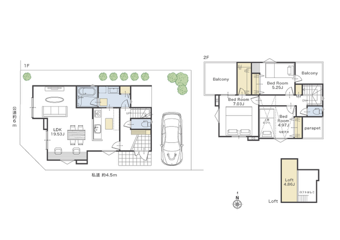 | 駐車場 | 1台 ~ 2台 | 道路の幅員 | 西側6m、開発道路4.5m |