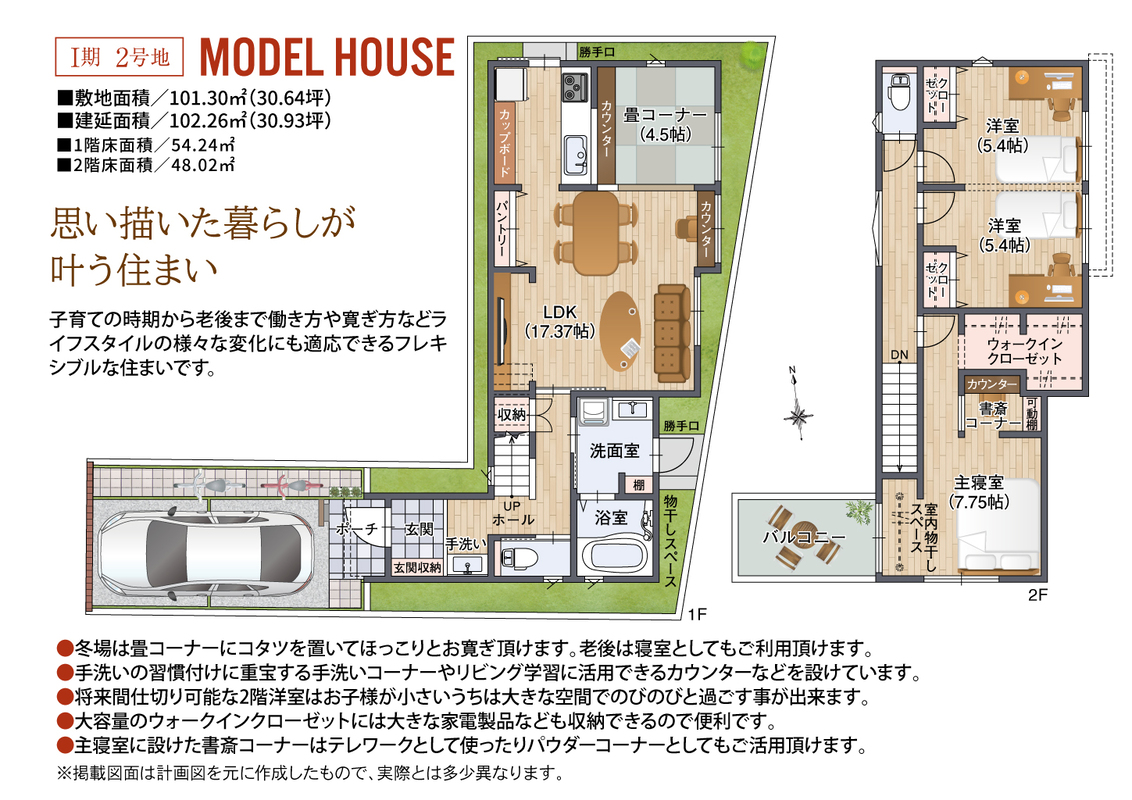 魅力1 第2期:敷地面積110m2超、限定2区画が登場!モデルハウス内覧予約受付中。