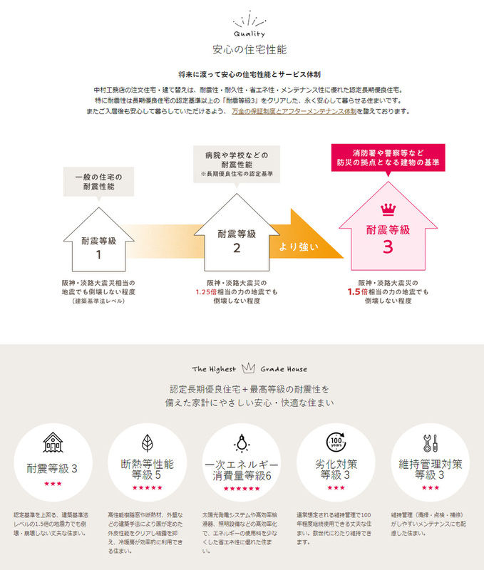 ■長期優良住宅の認定基準をベースにした長持ちする家。長期優良住宅の認定基準を上回る耐震等級が最高等級3の地震に強い住まい。