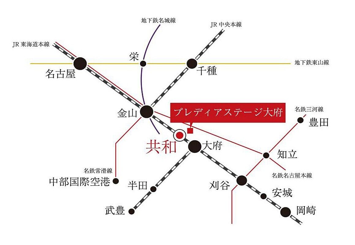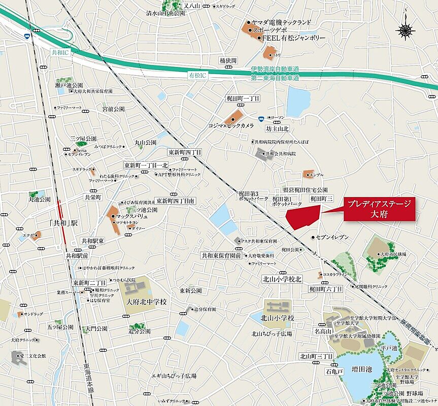 - JR東海道本線「共和」駅 徒歩20分~22分 自転車約7分~9分大府市ふれあいバス「梶田町四丁目」停 徒歩4分~6分 分譲地より約270m~460m