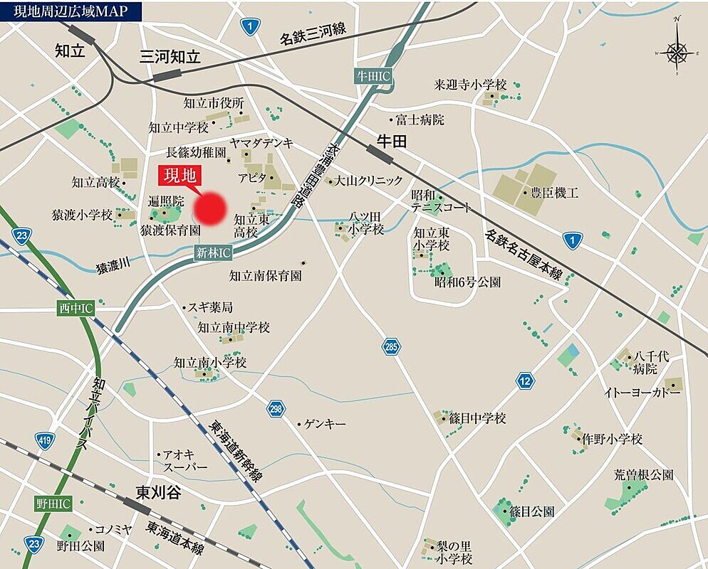 ■角地の整形地■名鉄三河線「三河知立」駅(歩約18~19分)■駅力■市立猿渡小学校(歩約8~10分)■ギャラリエアピタ知立店(歩約15~17分)■衣浦豊田「牛田」IC(車約6分)■知立市役所(歩約14
