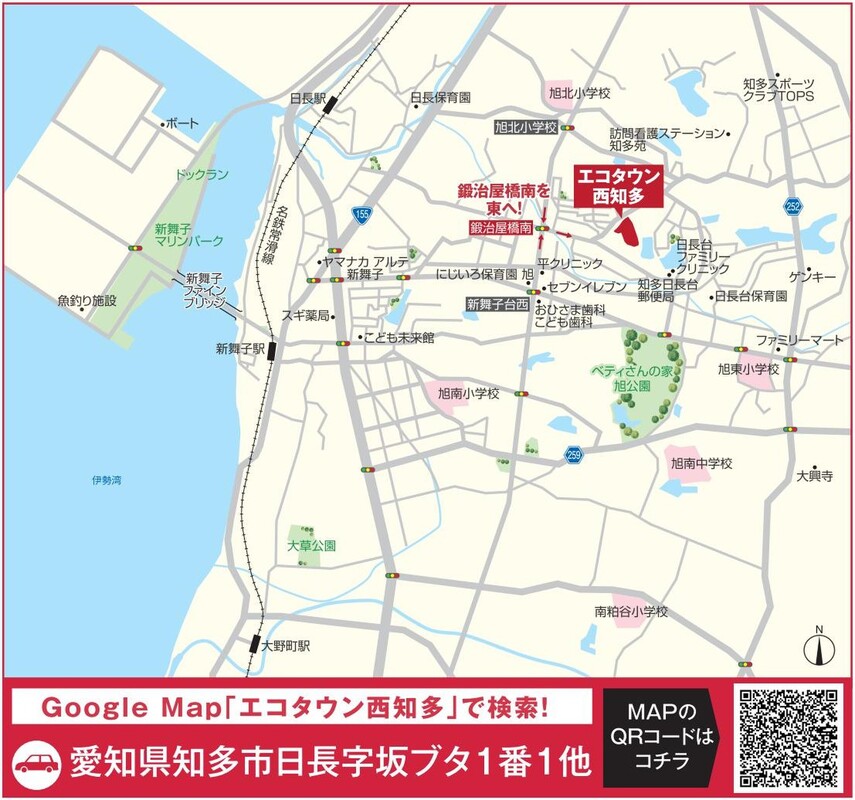 名鉄常滑線「新舞子」駅 徒歩29分~33分 (自転車約10分~11分) 知多バス「日長団地西」停 徒歩3分~4分 |