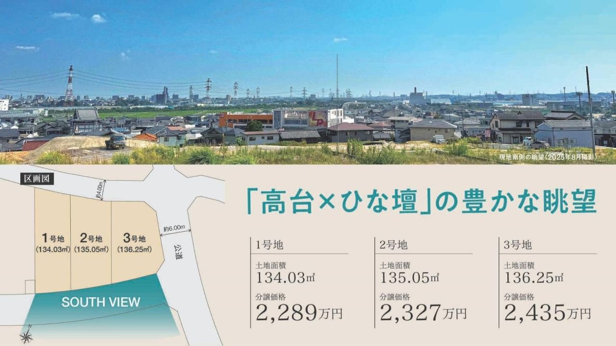 ●大府横根平子土地区画整理事業区域内25街区5-1番 他 ●造成工事完了/2025年9月末頃完成予定 ●土地引渡/2025年9月末以降 ●その他制限/地区計画(大府横根平子地区計画A地区) 22条指定区域 76条申請 ●まちなみガイドライン ●水道負担金/110,000円(税込)口径20mmの場合 【周辺環境】 東海道本線「大府」駅 徒歩 29分 バス「神田児童老人福祉センター」停 徒歩 6分 武豊線「大府」駅 徒歩 29分 ファミリーマート 大府横根町店 610m マックスバリュ大府横根店 850m リソラ 大府 ショッピング テラス 2930m なだか山クリニック 960m セイダ歯科医院 430m 大府市役所 2270m 大府大和幼稚園 700m 市立神田小学校 1400m 徒歩18分 市立大府中学校 1980m 徒歩25分 二ツ池公園 1400m |