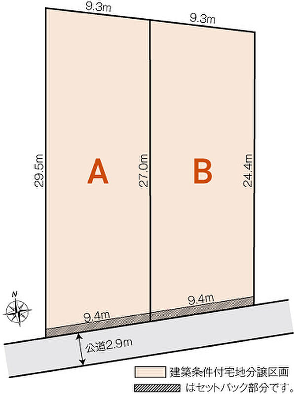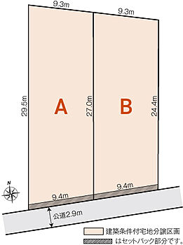 | 建物面積 | - | 土地面積 | 239.9m2~263.33m2私道負担有りセットバックによる私道負担あり。A号地(5.20m2)、B号地(5.56m2)。 |
