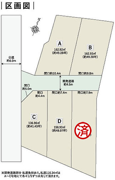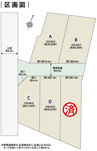 | 建物面積 | - | 土地面積 | 136.96m2~162.93m2私道負担有り私道負担/開発道路部分あり。私道116.34m2はA~E号地にて各々1/5ずつ共有していただきます。 |
