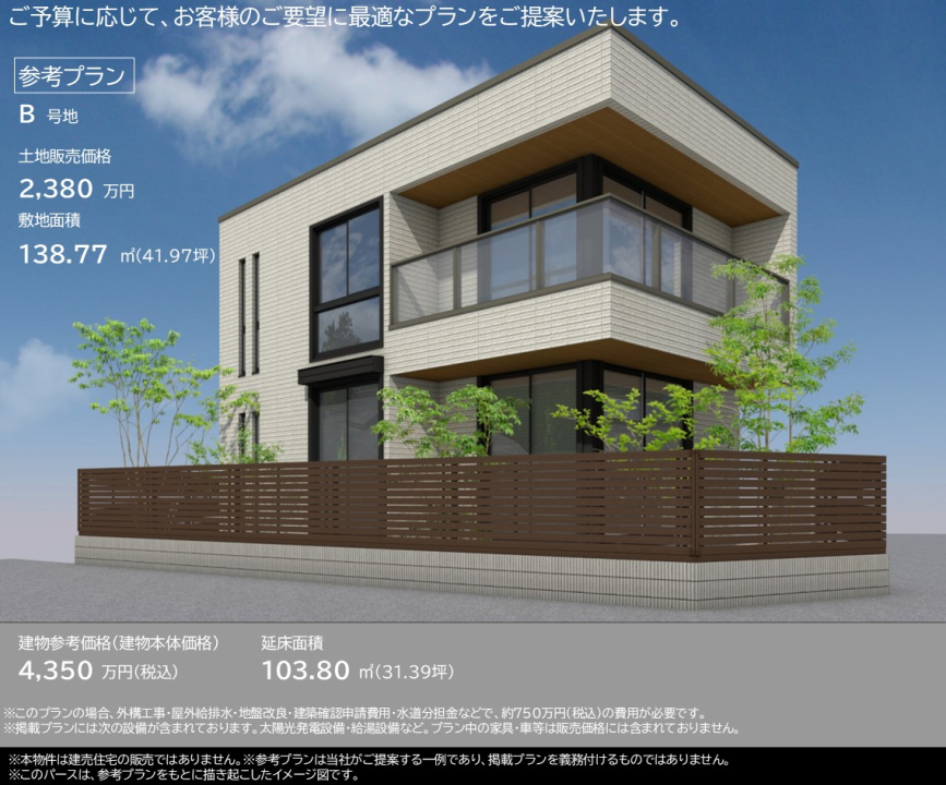 | 建築条件 | 建築条件付 建築条件付き土地とは一定期間内に、その土地に建築する建物の請負契約が締結されることを条件に販売される土地のことです。 土地売買契約締結後、建築請負会社と購入した土地に建築する建物について協議することになります。広告に参考プランが掲載されている場合でも、プランは一例であり、実際の建築プランは建築請負会社と土地購入者で協議・検討することが可能です。 期間内に建築プランが決まらず建築請負契約が成立しなければ土地売買契約は白紙となり、支払済みの金銭はすべて返還されます。 建築請負会社が指定されている場合と指定されていない場合があります。 また、建築条件付き土地の価格には、建物価格は含まれません。 |