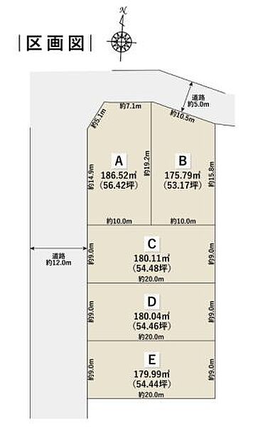 | 備考 | 〇北側道路は北西側の計画道路(時期未定)の完成時には、西側に通り抜けできなくなる可能性があります。〇水道分担金:(口径20mm)144,100円(消費税を含む)〇水道引込工事費用:約80万円(A・B)、約130万円(C・E)、約200万円(D)〇ゴミステーションがいずれかの区画に設置される場合があります○各施設の距離・時間は地図上の概算で徒歩時間は80mを1分として換算したものです。建築基準法第22条区域、都市再生特別措置法、景観法、農地法、航空法、宅地造成及び特定盛土等規制法●本分譲地の土地売買契約は、契約締結後3ヶ月以内に販売代理人である積水ハウス株式会社との間で建築工事請負契約が成立することを条件として効力を生じることとなります。期限までに建築工事請負契約が成立しなかったときは、土地売買契約の無効が確定し、受領済の手付金等は、全額無利息にてすみやかに返還いたします。 | ||