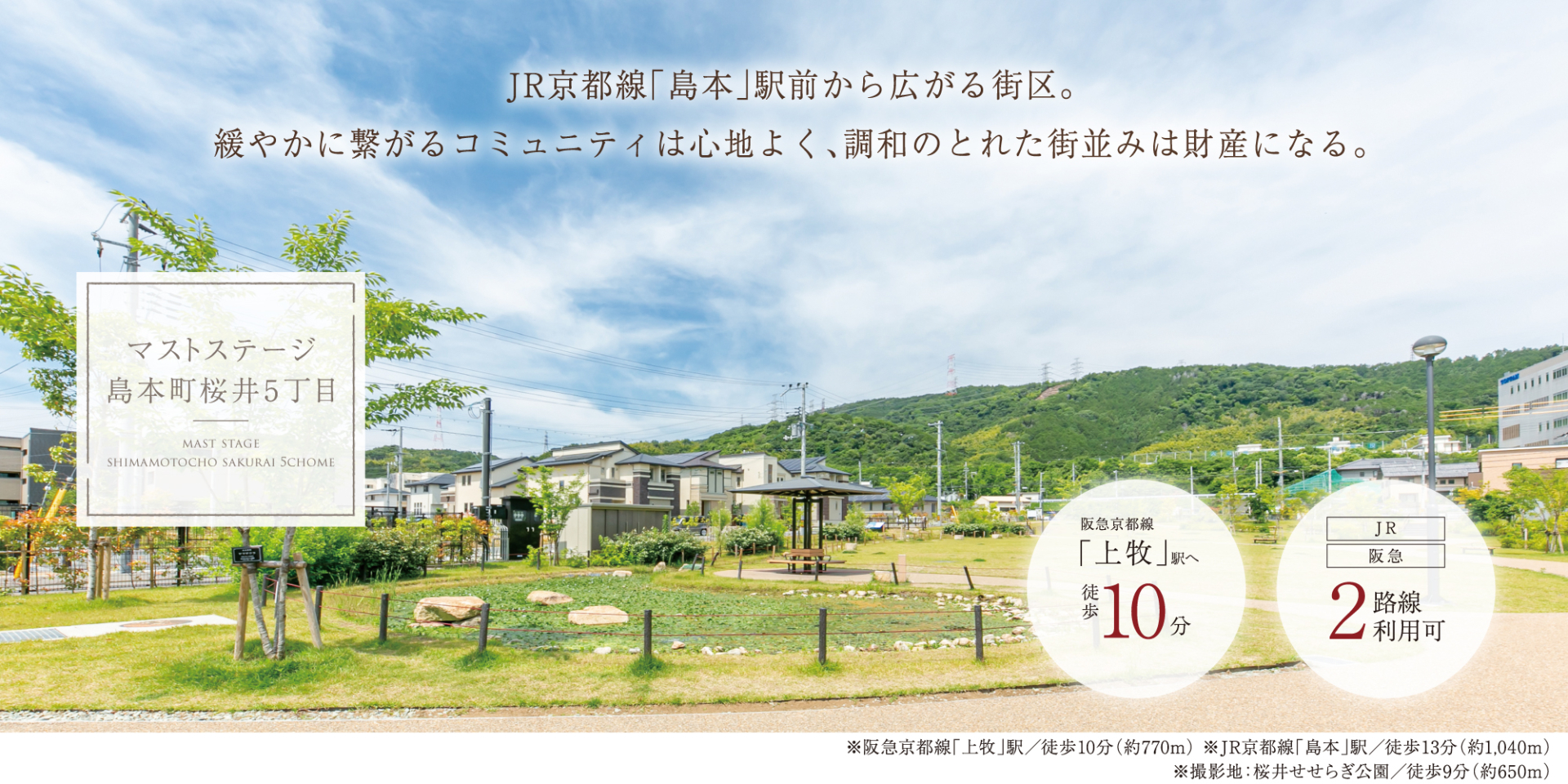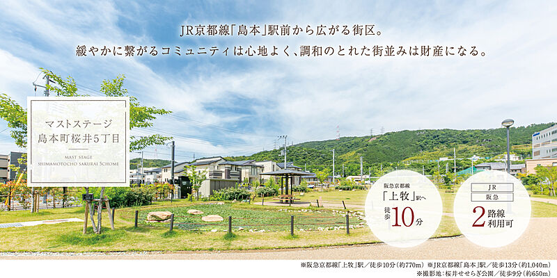 阪急京都本線「上牧」駅 徒歩10分 JR東海道・山陽本線「島本」駅 徒歩13分 |